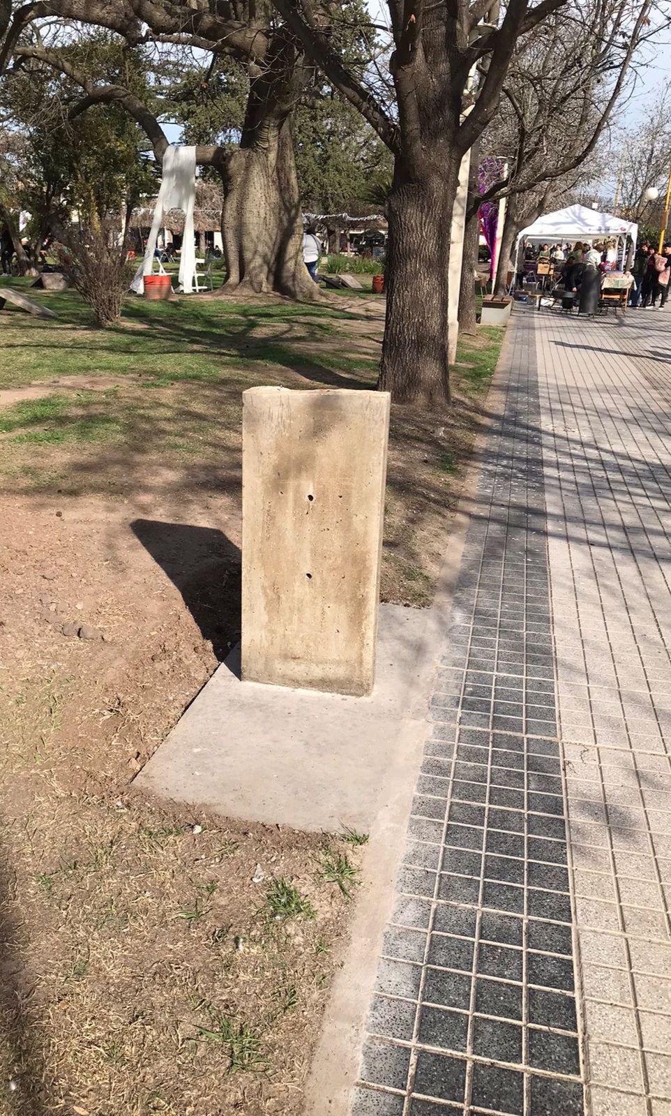 Muchos transeúntes, paseantes y los que disfrutan de ese espacio público pasan, miran y arriesgan: qué serán esas placa de hormigón? Un bebedero, nuevos bancos, espacio para grafica publicitaria pública. Lo cierto es que nada de eso es correcto.