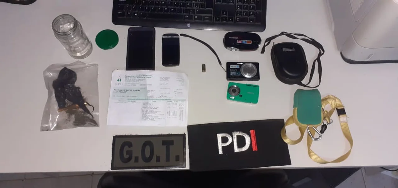 Al tiempo que en Hughes incautaron dos teléfonos celulares, documentación varia, dos cámaras digitales, una cámara filmadora, una vaina servida y una bolsa de nylon con marihuana, además de una pipa.