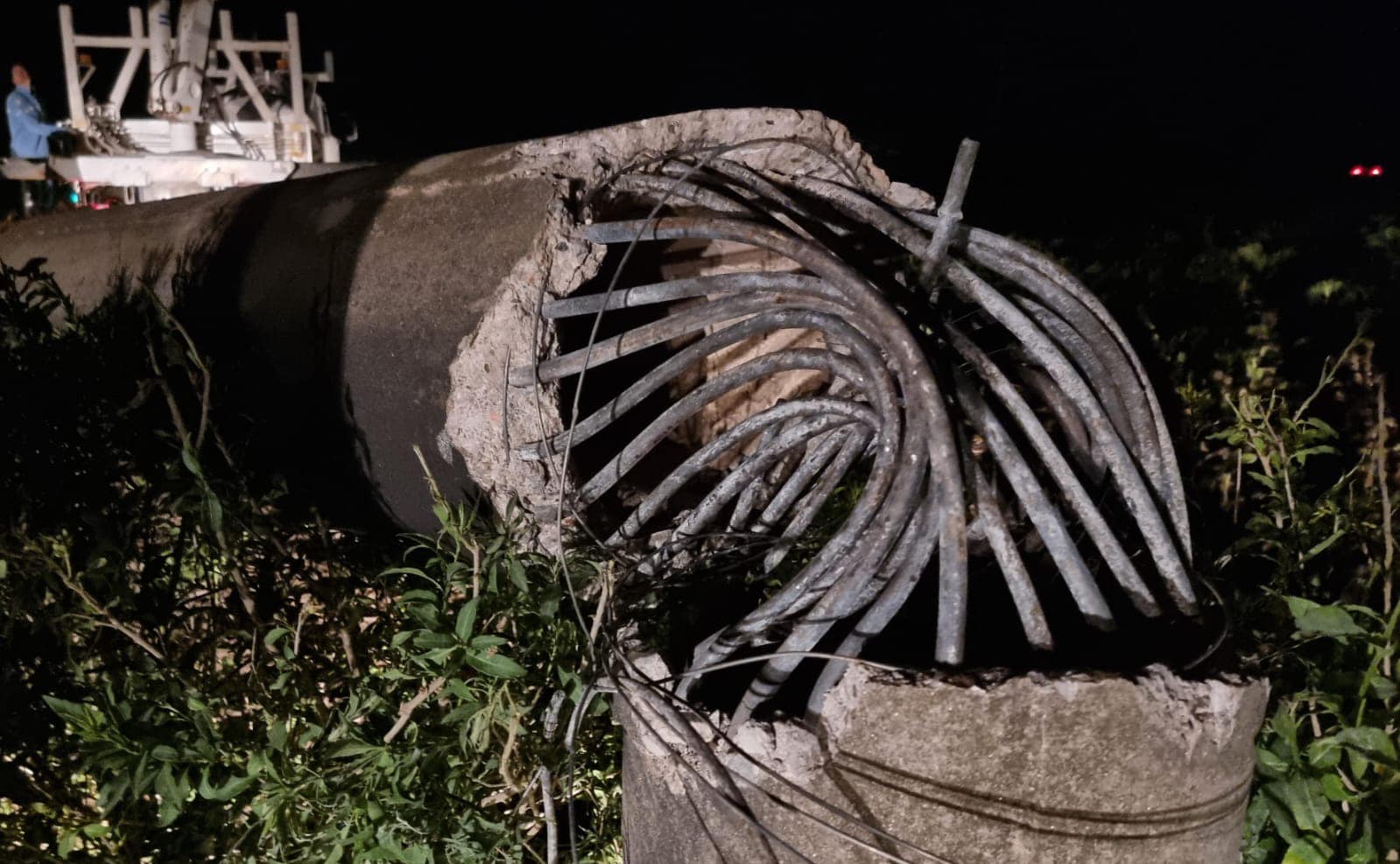 Para hacer caer el poste, rompieron el hormigón del mismo, dejando los hierros al descubierto y sin apoyo, lo que provocó que estos de venzan y la columna caiga.