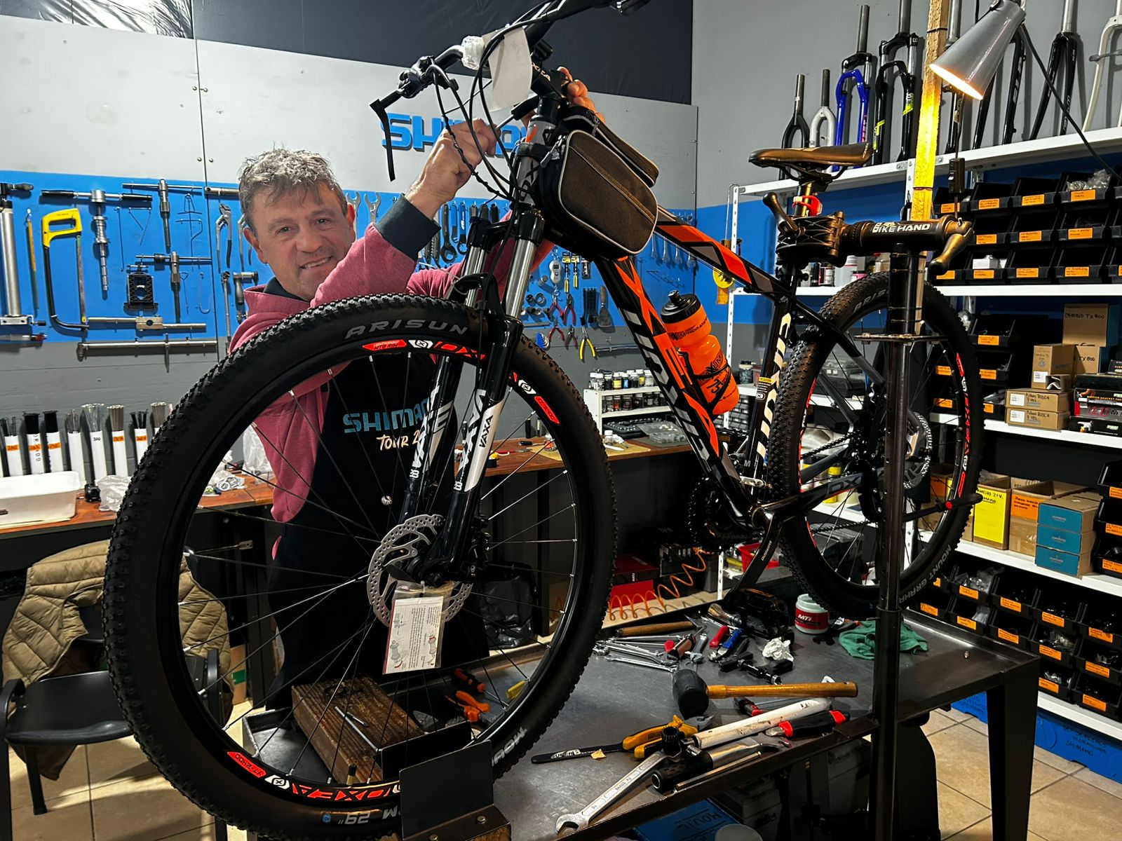 -Sí, además, servicio técnico especializado en lo que es Shimano. Estoy permanentemente asistiendo a los cursos. La marca Shimano es un poco exigente en eso; no es un curso abierto cualquiera, sino que ellos seleccionan a los mecánicos que van a invitar y tengo la suerte de que siempre me tengan en cuenta.